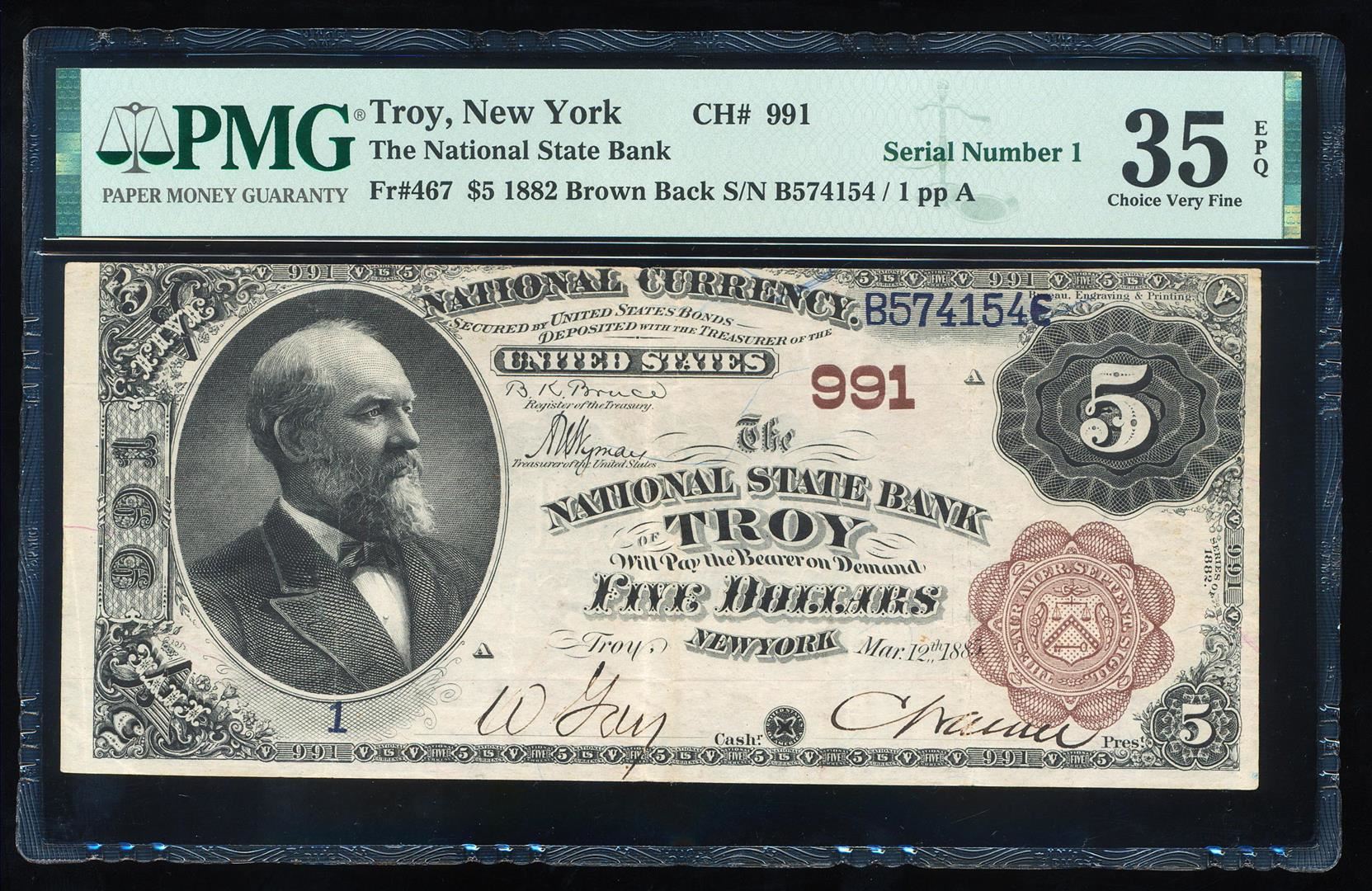 One Serial # 1 - 1882BB $5 Troy, NY CH# 991 National Note CH# 991 PMG Ch. Very Fine 35EPQ. PMG Certified.