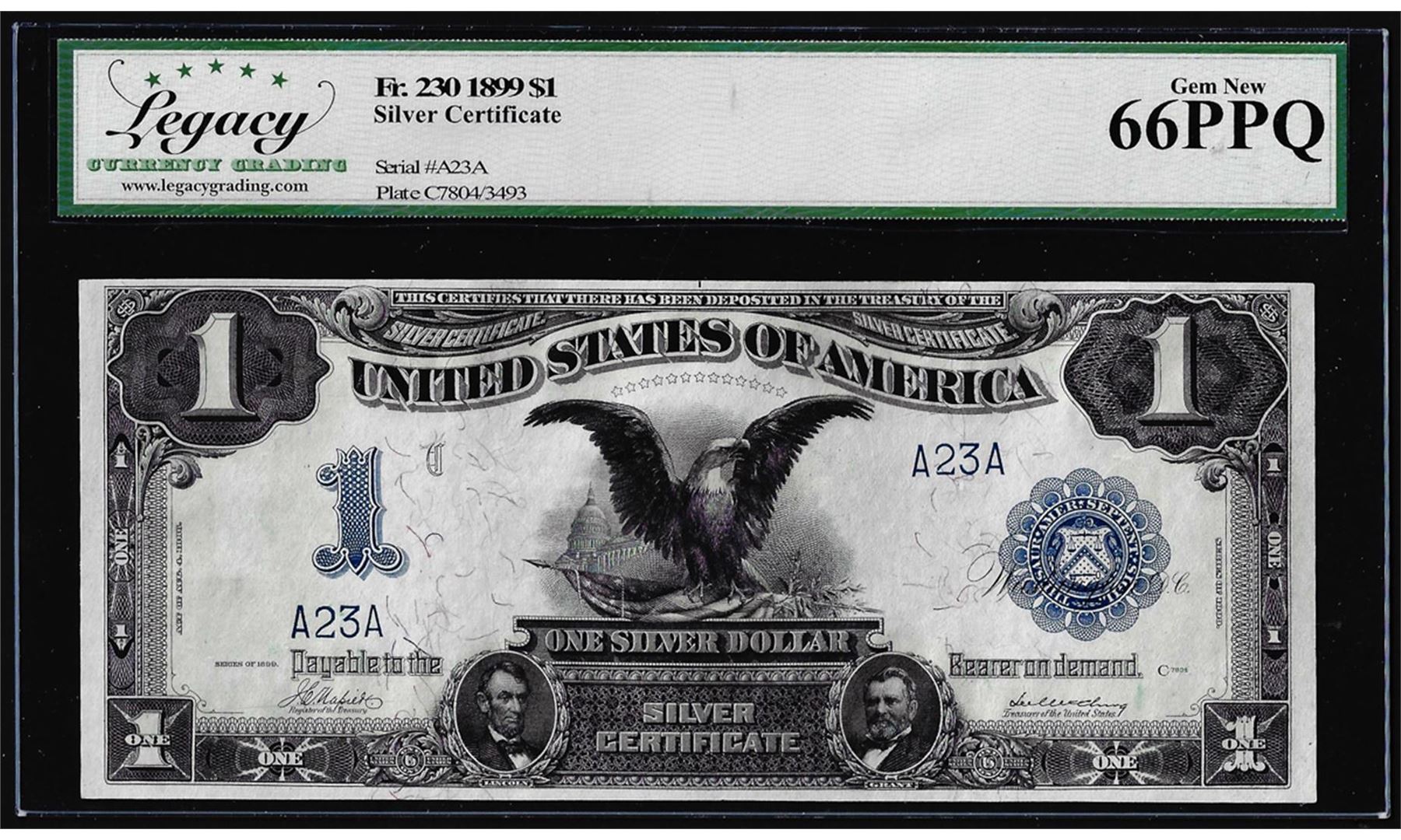 One Serial # 23 - 1899 $1 Black Eagle Silver Certificate Note Fr.230 Legacy Gem New 66EPQ. Legacy Graded.