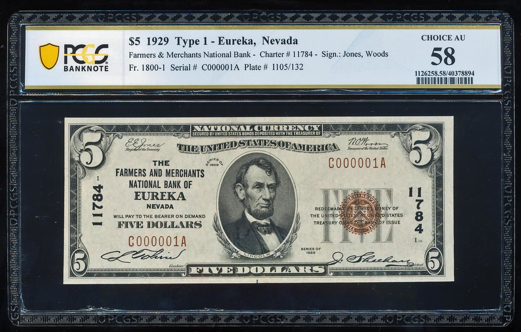 Serial Number 1 - 1929 $5 Eureka, NV CH# 11784 National Bank Note PCGS Choice AU58