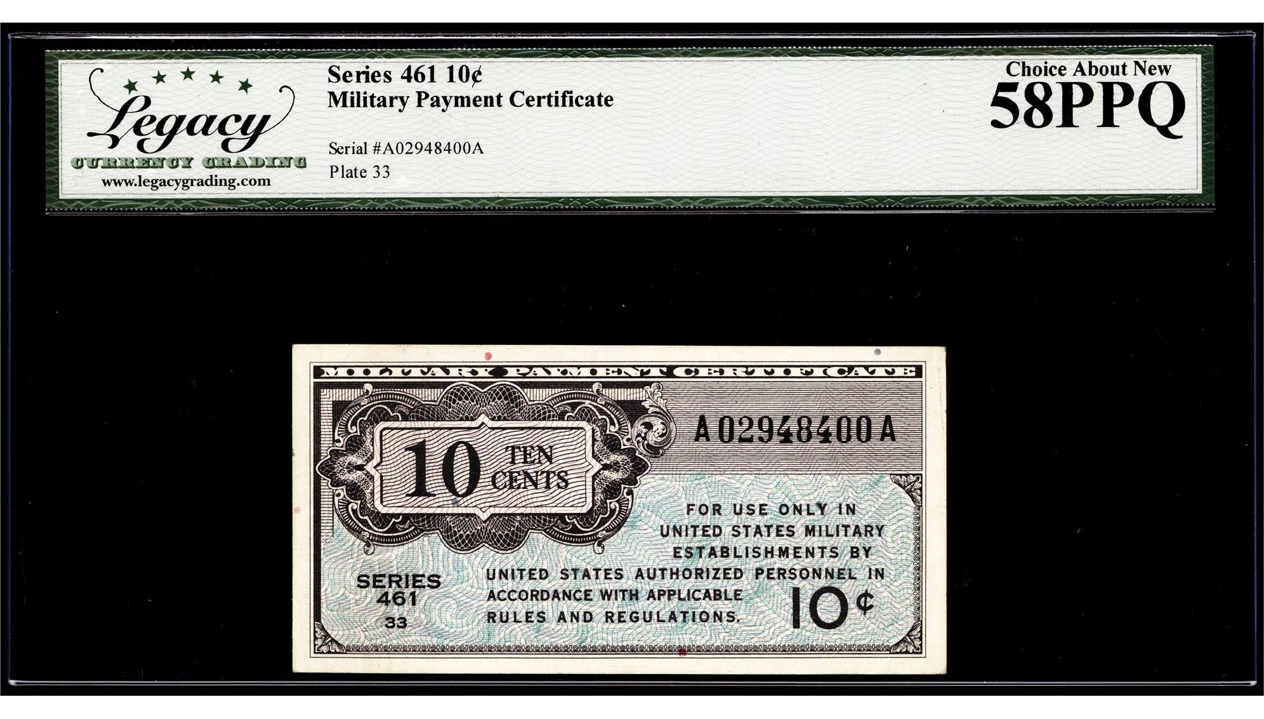 One Series 461 Ten Cents Military Payment Certificate Legacy Choice About New 58PPQ. Legacy Graded.