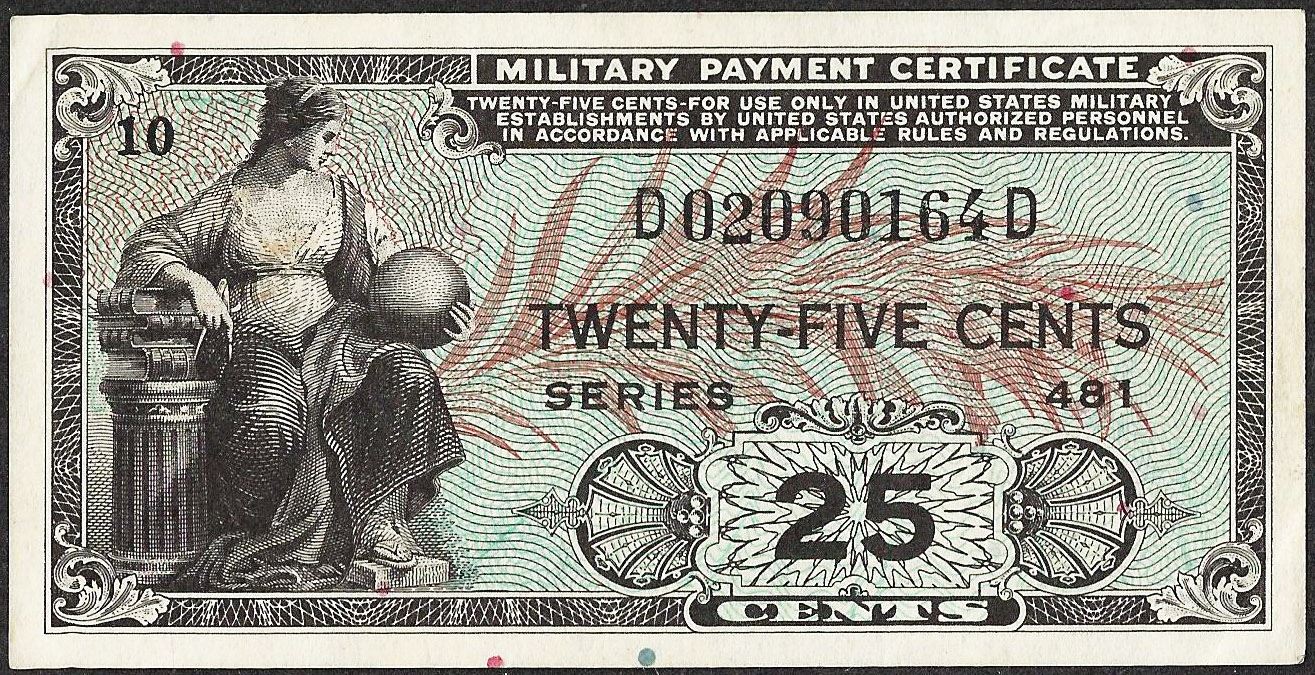 One Series 481 Twenty-Five Cents Military Payment Certificate Note.