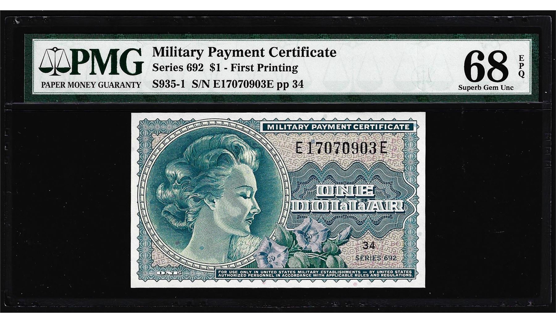 One Series 692 $1 Military Payment Certificate Note PMG Superb Gem Unc 68EPQ. PMG Certified.