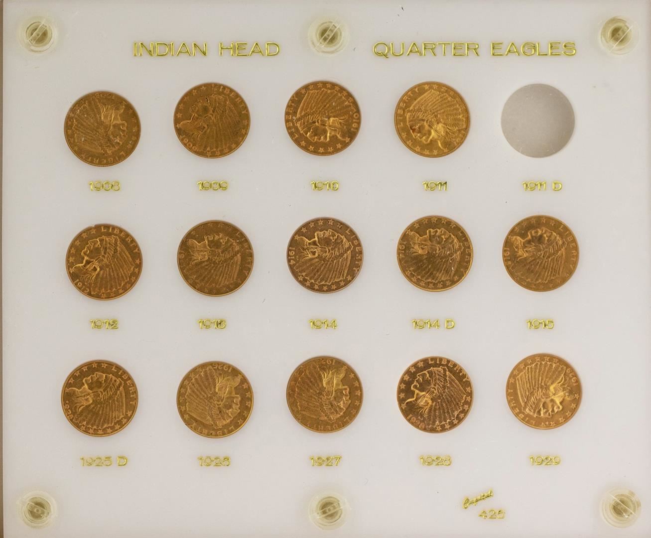 One Set of 1909-1929 $2 1/2 Indian Head Quarter Eagle Gold Coins. Please note that the 1911-D is not shown and is not included in set.