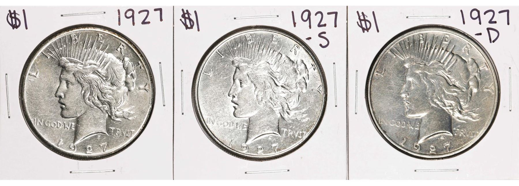 One Set of 1927-P/D/S $1 Peace Silver Dollar Coins.