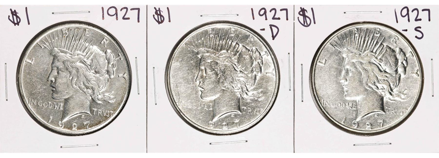 One Set of 1927-P/D/S $1 Peace Silver Dollar Coins.