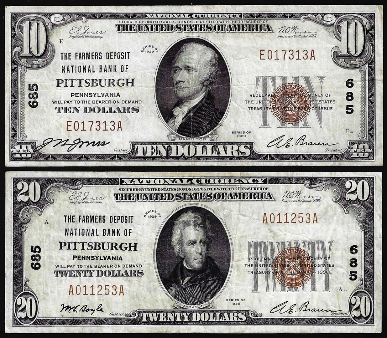 One Set of 1929 $10/$20 NB of Pittsburgh, PA CH# 685 National Currency Notes.