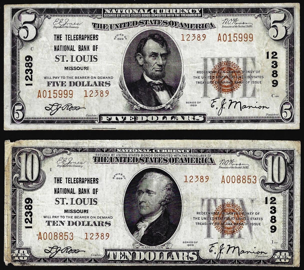 Set of 1929 $5/$10 St. Louis, MO CH# 12389 National Currency Notes