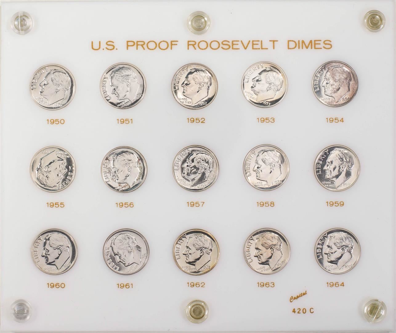 Set of 1950-1964 Proof Roosevelt Dime Coins in Capital Plastic Holder