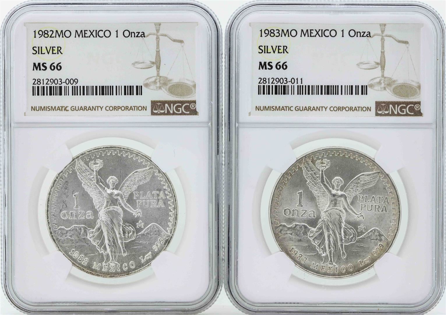 Set of 1982MO-1983MO Mexico 1 Onza Silver Libertad Coin NGC MS66