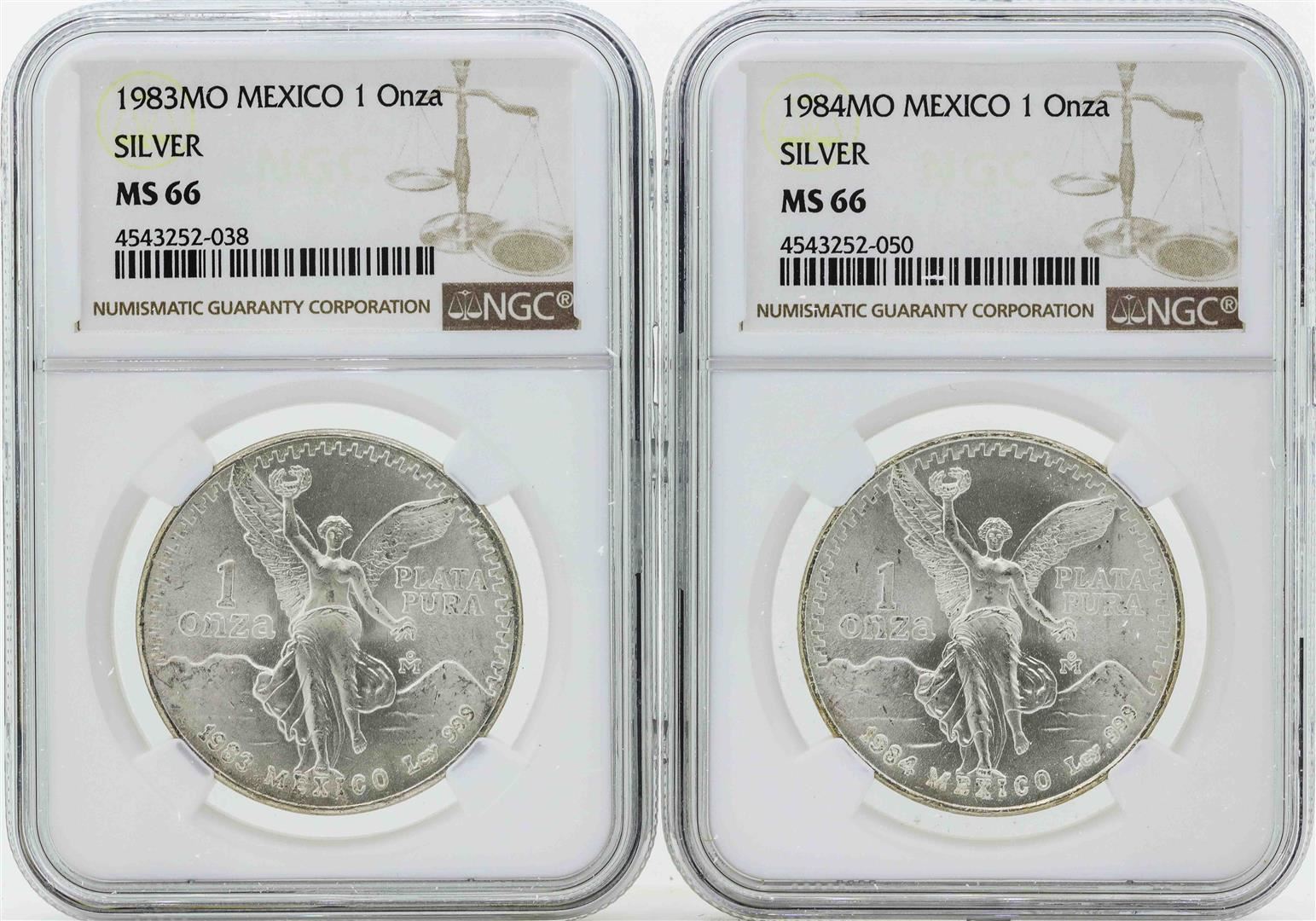 Set of 1983MO-1984MO Mexico 1 Onza Silver Libertad Coins NGC MS66