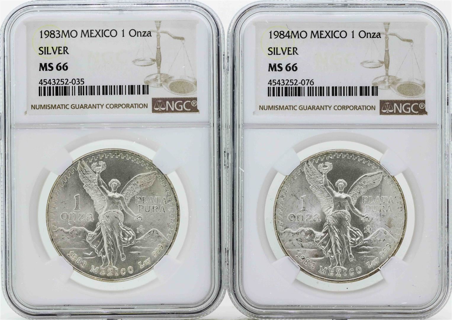 Set of 1983MO-1984MO Mexico 1 Onza Silver Libertad Coins NGC MS66