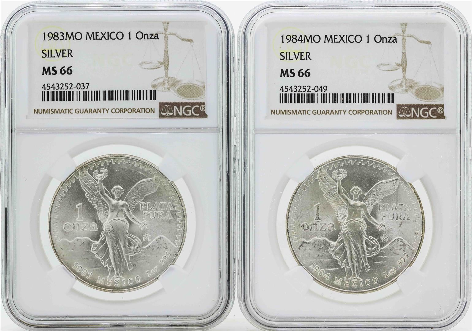 Set of 1983MO-1984MO Mexico 1 Onza Silver Libertad Coins NGC MS66