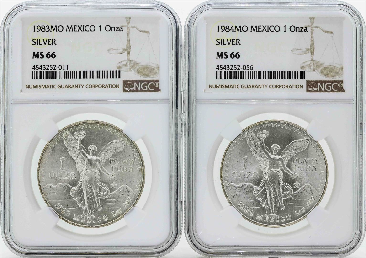 Set of 1983MO-1984MO Mexico 1 Onza Silver Libertad Coins NGC MS66