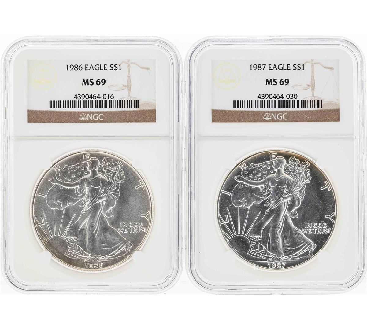 One Set of 1986-1987 $1 American Silver Eagle Coins NGC MS69. NGC Certified.