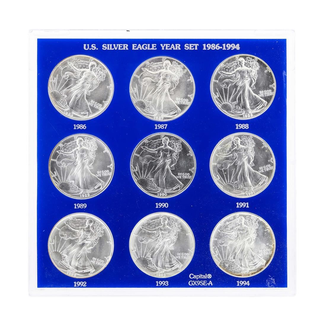 One Set of 1986-1994 $1 American Silver Eagle Coins.