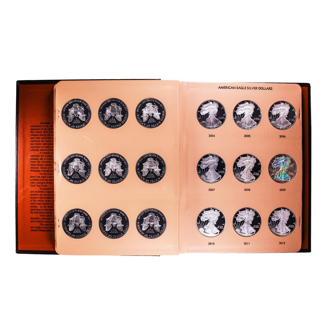 One Set of 1986-2020 $1 Proof American Silver Eagle (37) Coins in Dansco Book, please note that the 2009 coin appears to have been altered with a hologram finish.