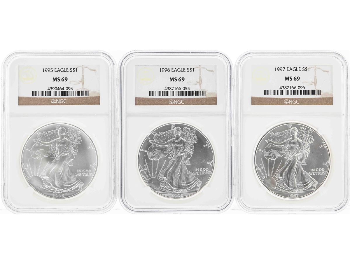 One Set of 1995-1997 $1 American Silver Eagle Coins NGC MS69. NGC Certified.