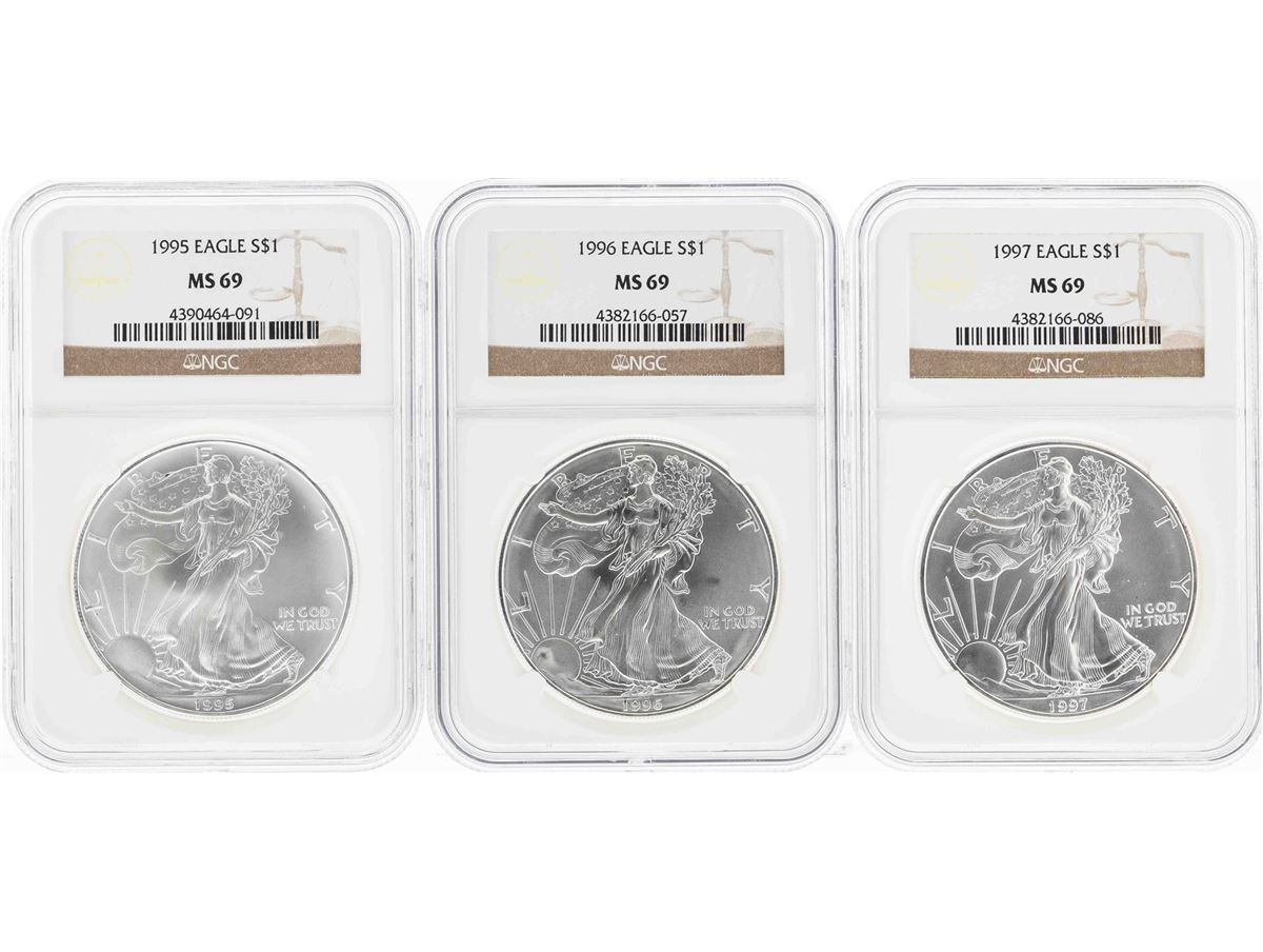 One Set of 1995-1997 $1 American Silver Eagle Coins NGC MS69. NGC Certified.