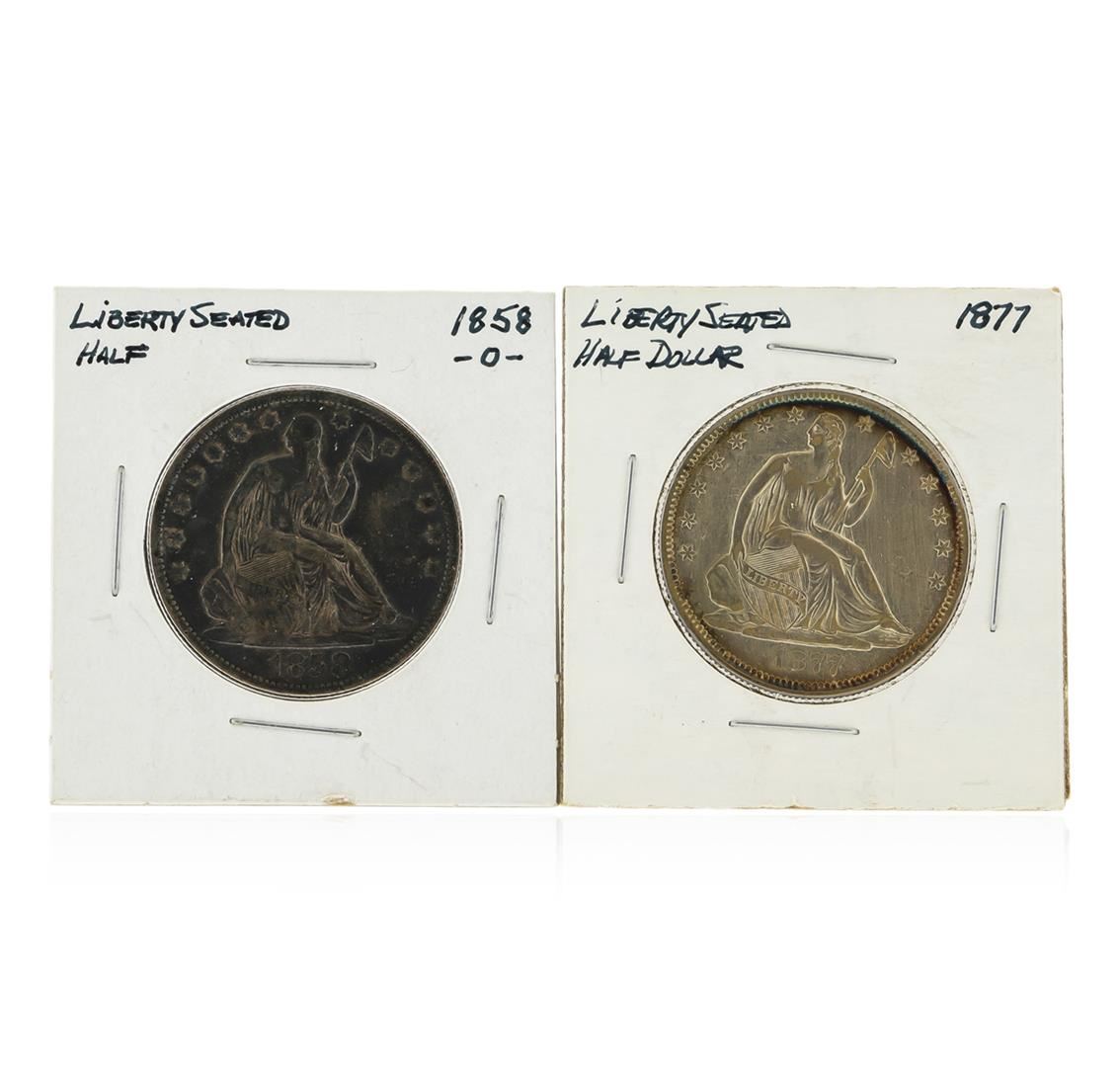 Set of (2) 1858-O and 1877 Silver Liberty Seated Half Dollar Coins