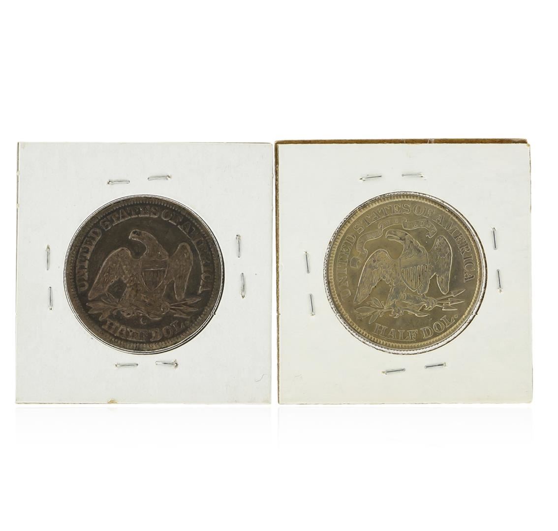 One Set of (2) 1858-O and 1877 Silver Liberty Seated Half Dollar Coins.