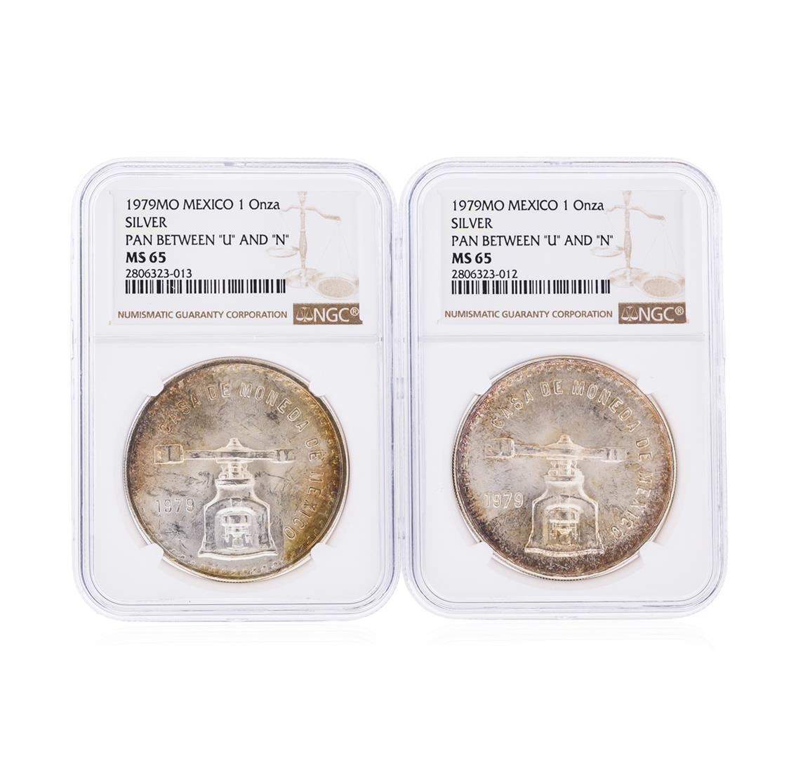 One Set of (2) 1979MO Mexico 1 Onza Silver Pan Between "U" and "N" Coins NGC MS65. NGC Certified.