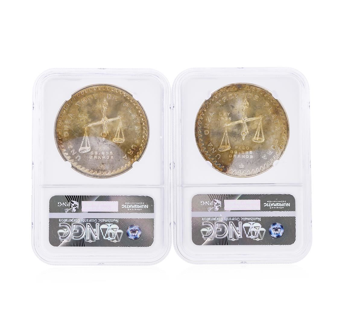 Set of (2) 1979MO Mexico 1 Onza Silver Pan Between "U" and "N" Coins NGC MS65