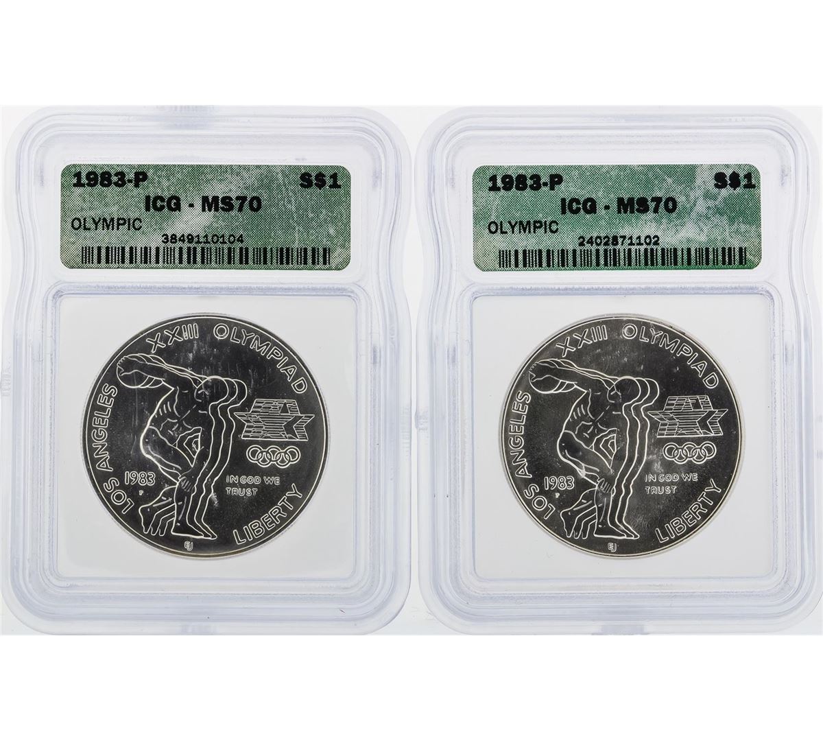 One Set of (2)1983-P $1 Olympic Silver Coins ICG MS70. ICG Certified.