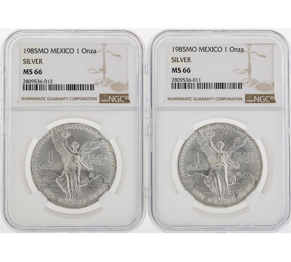 One Set of (2) 1985MO Mexico $1 Silver Coin NGC MS66. NGC Certified.