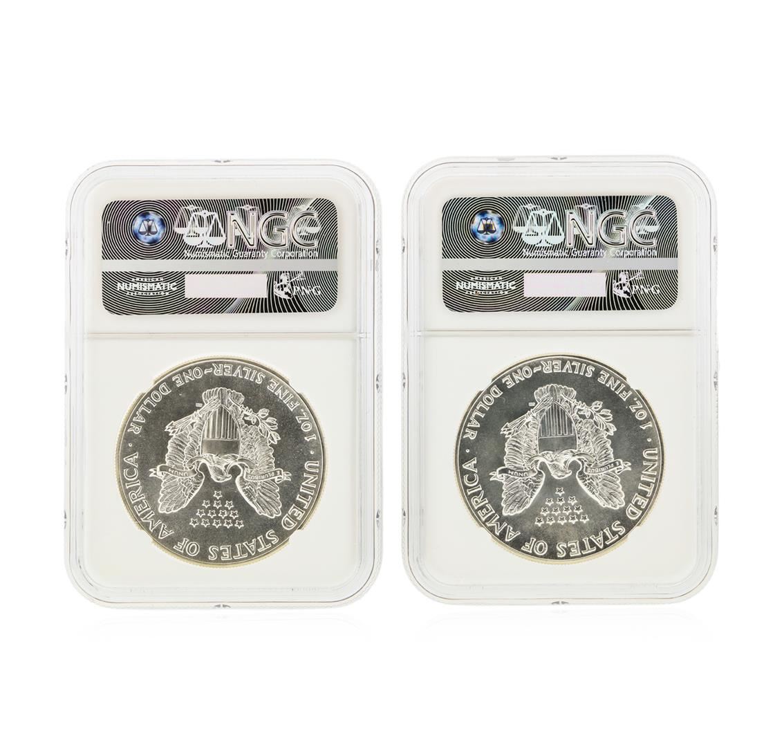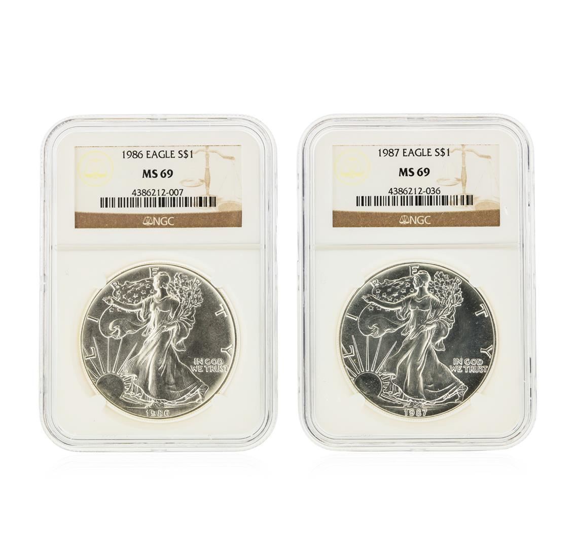 One Set of (2) 1986-1987 $1 Silver Eagle Coins NGC Graded MS69. NGC Certified.