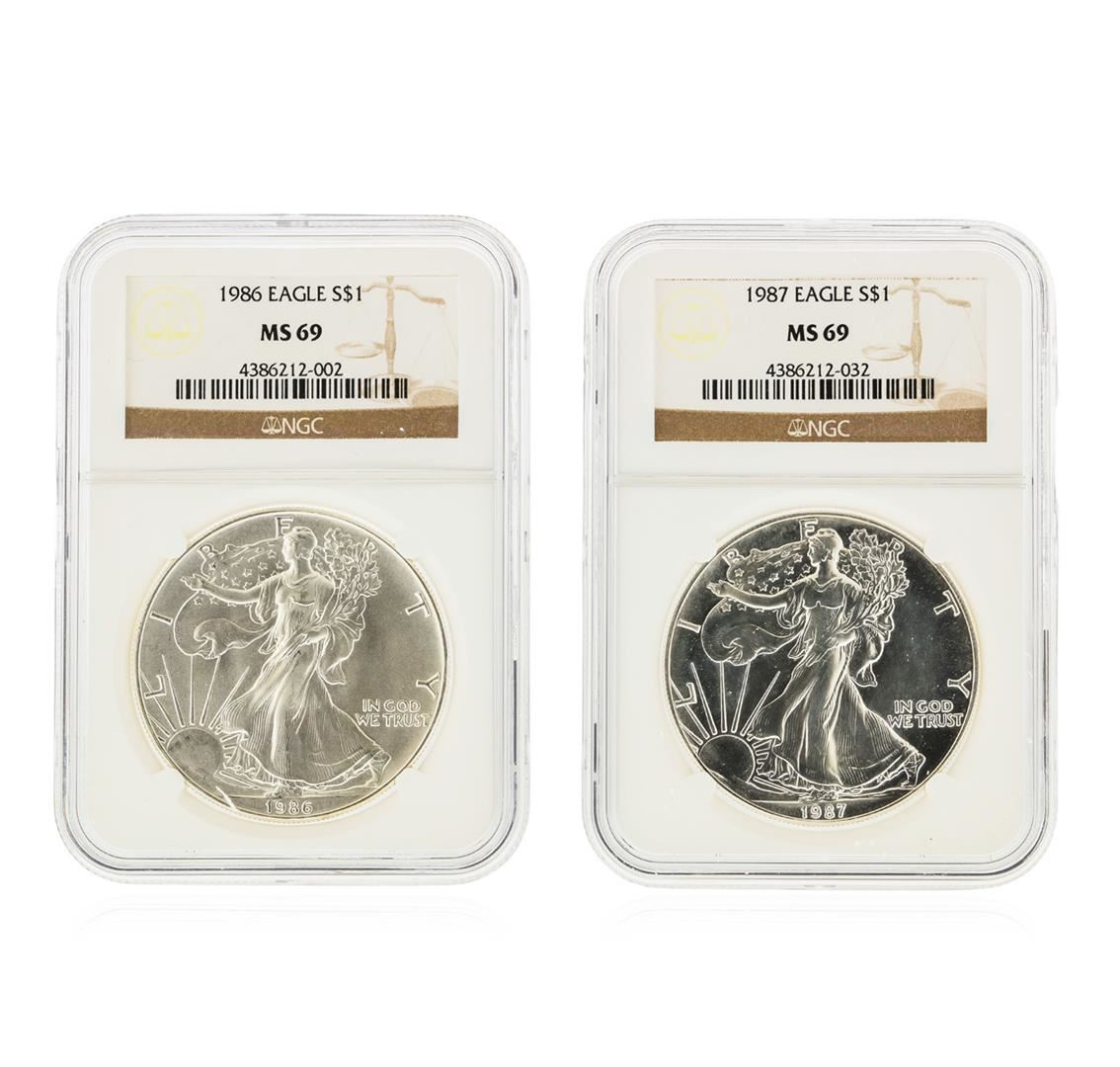 One Set of (2) 1986-1987 $1 Silver Eagle Coins NGC Graded MS69. NGC Certified.