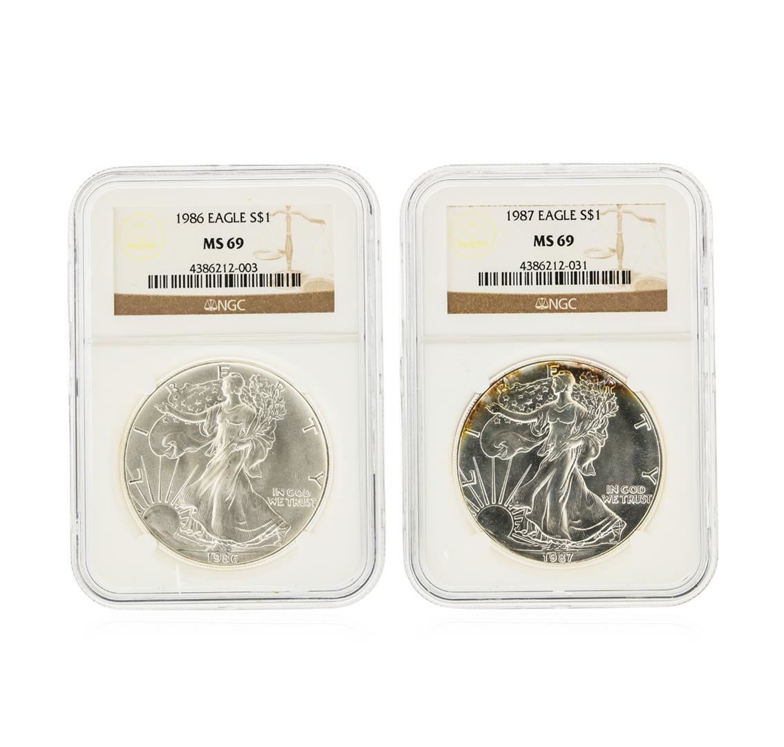 One Set of (2) 1986-1987 $1 Silver Eagle Coins NGC Graded MS69. NGC Certified.