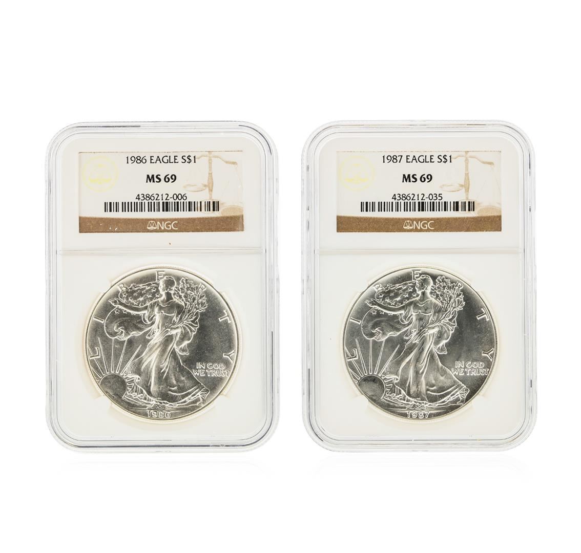 One Set of (2) 1986-1987 $1 Silver Eagle Coins NGC Graded MS69. NGC Certified.