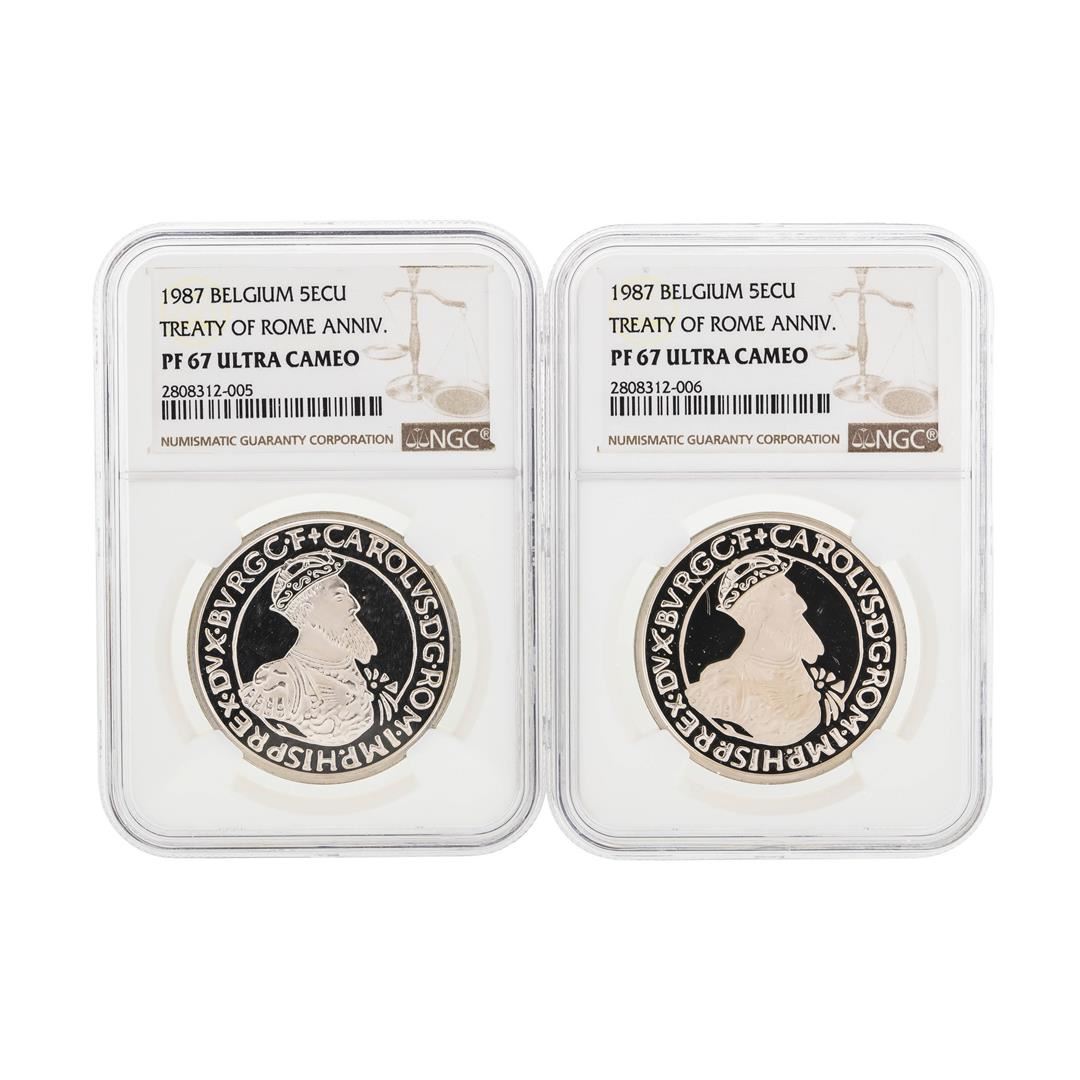 One Set of (2) 1987 Belgium 5 ECU Silver Coins NGC PF67 Ultra Cameo. NGC Certified.
