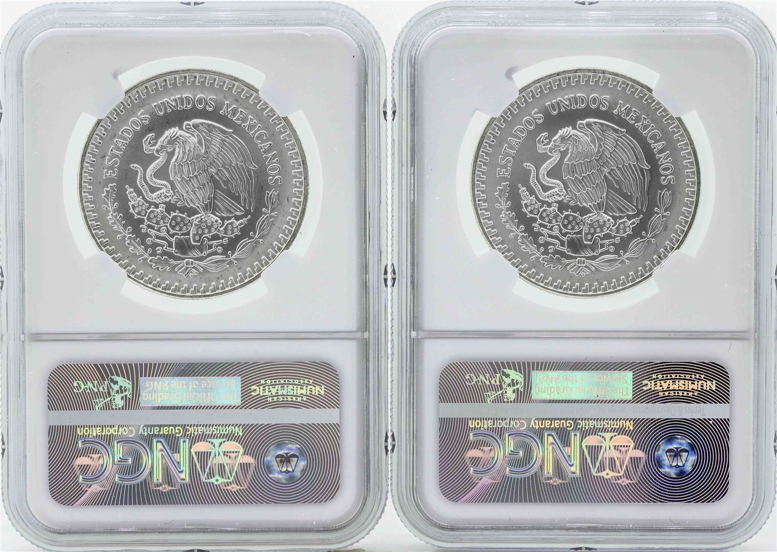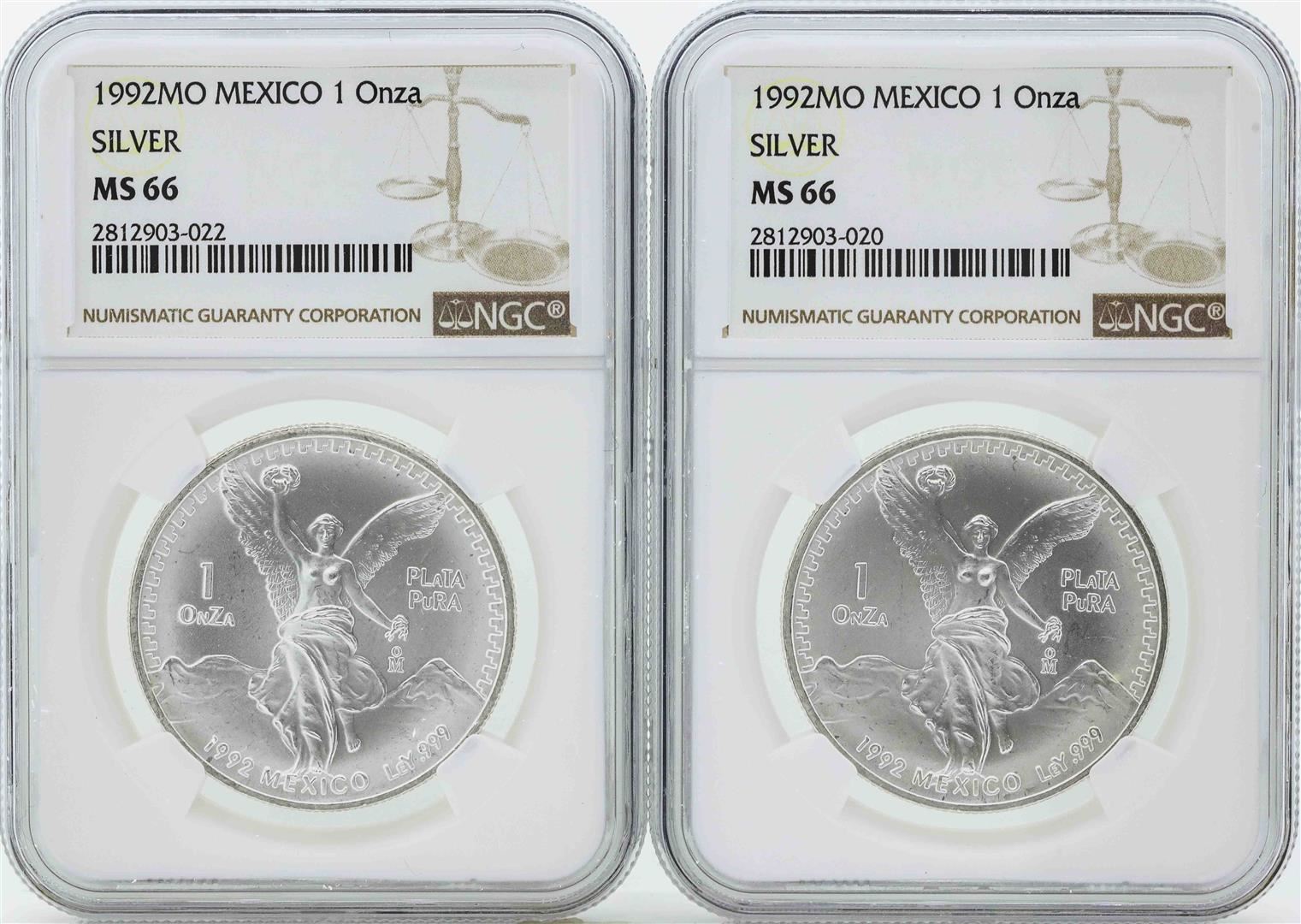 One Set of (2) 1992MO Mexico 1 Onza Silver Libertad Coins NGC MS66. NGC Certified.