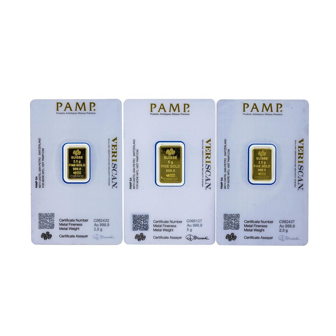 One Set of (2) 2.5 Gram & (1) 5 Gram Swiss Made PAMP Ingot Cards.