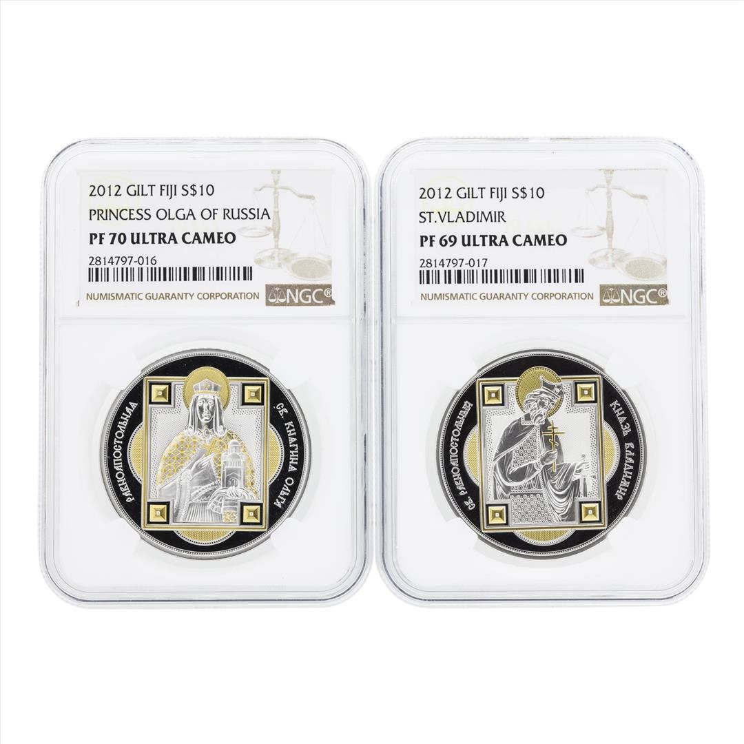 One Set of (2) 2012 Gilt Fiji $10 Silver Coins NGC PF70 Ultra Cameo.