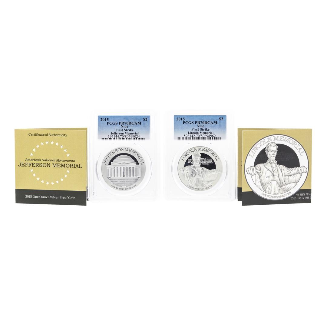 One Set of (2) 2015 $2 Niue Jefferson & Lincoln Memorial Silver Proof Coins PCGS PR70DCAM. PCGS Graded.