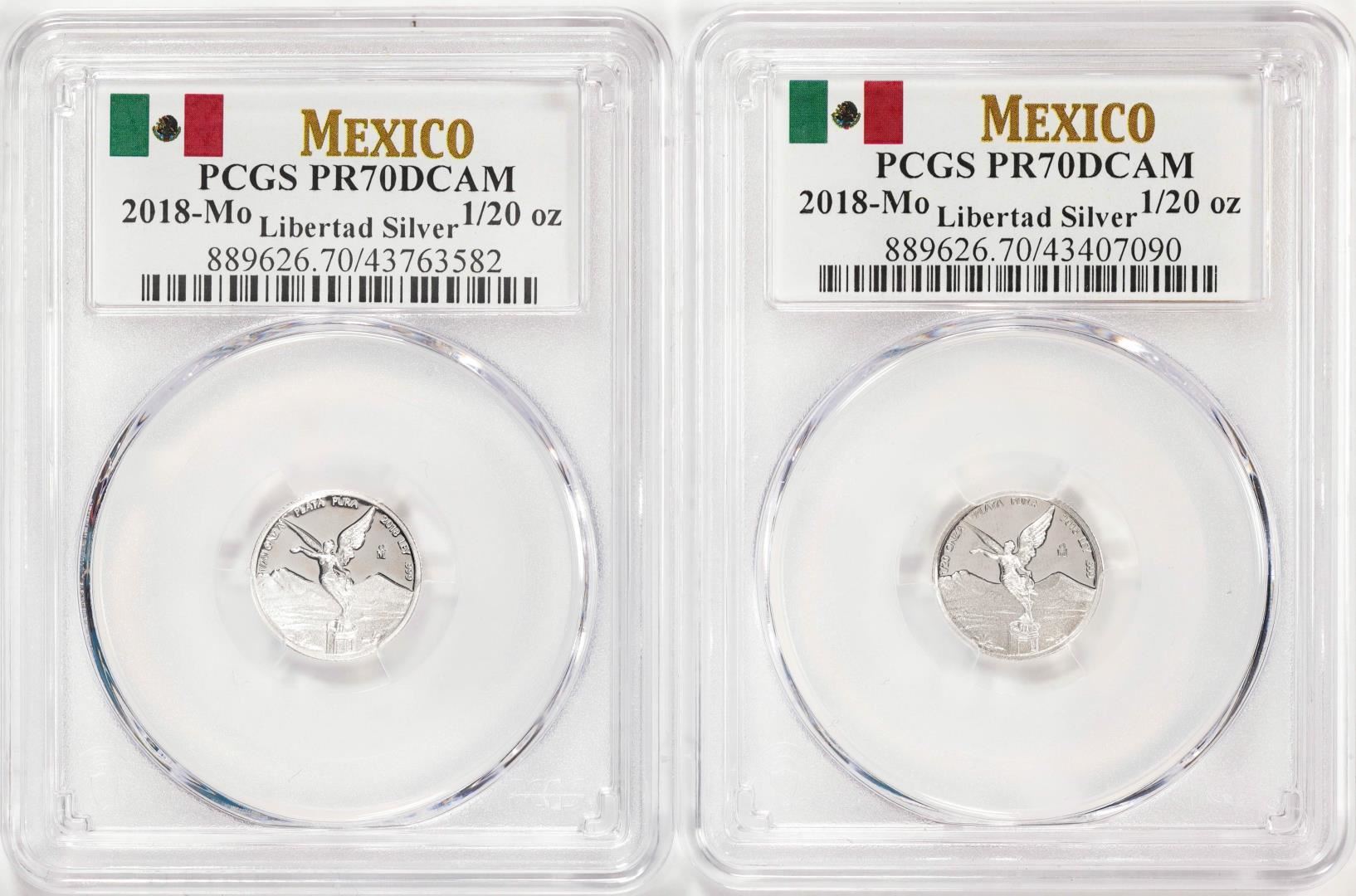 Set of (2) 2018Mo Mexico Proof 1/20 oz Silver Libertad Coins PCGS PR70DCAM