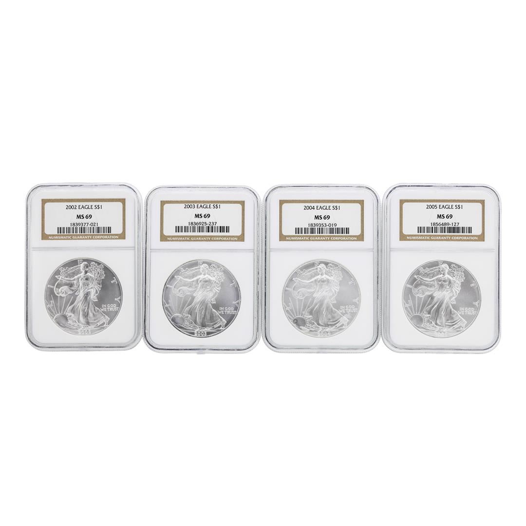 Set of 2002-2005 $1 American Silver Eagle Coins NGC MS69