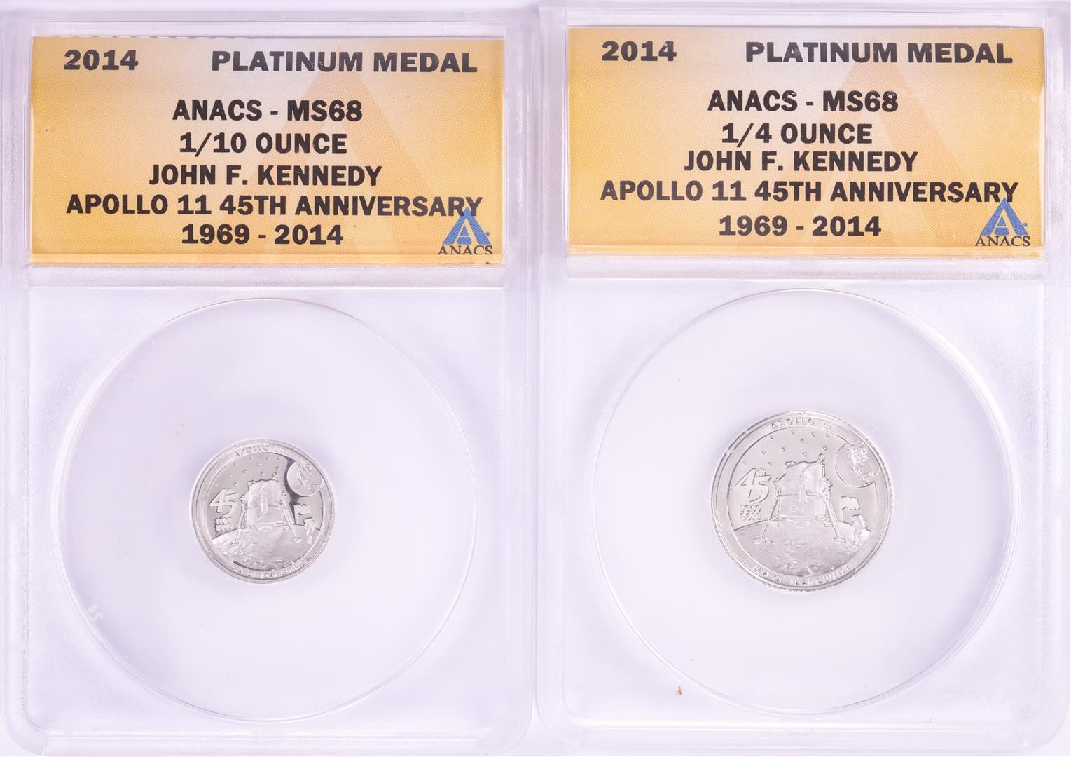 Set of 2014 Proof 1/10 & 1/4 oz Platinum JFK Apollo 11 Anniversary Medals ANACS MS68