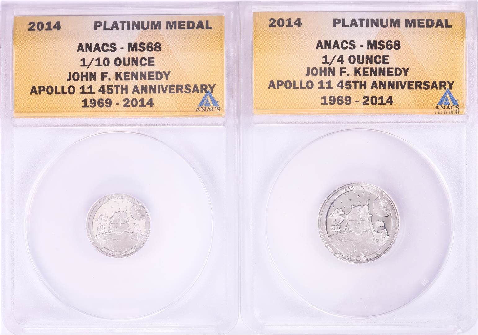 One Set of 2014 Proof 1/10 & 1/4 oz Platinum JFK Apollo 11 Anniversary Medals ANACS MS68. ANACS Certified.