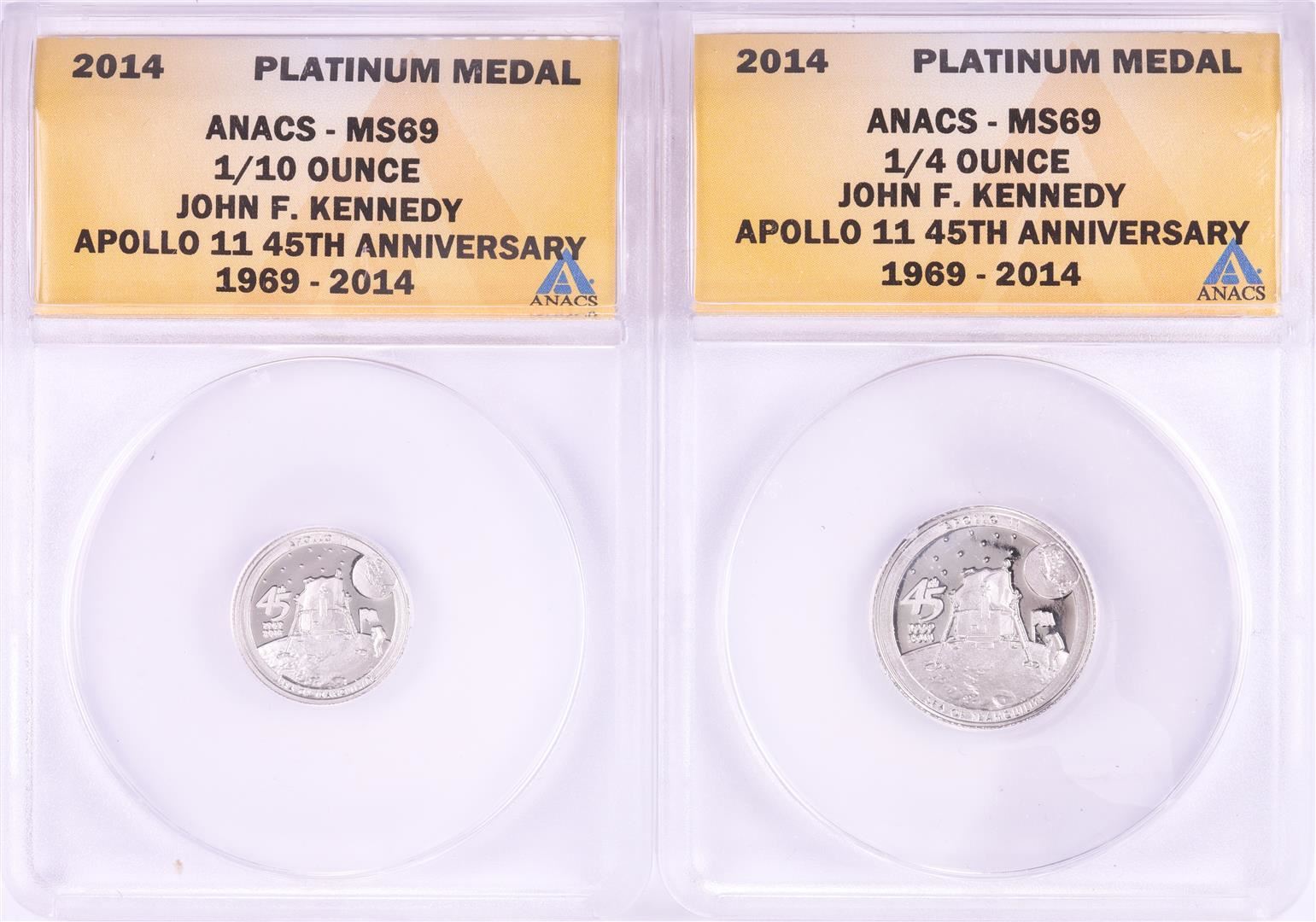 Set of 2014 Proof 1/10 & 1/4 oz Platinum JFK Apollo 11 Anniversary Medals ANACS MS69