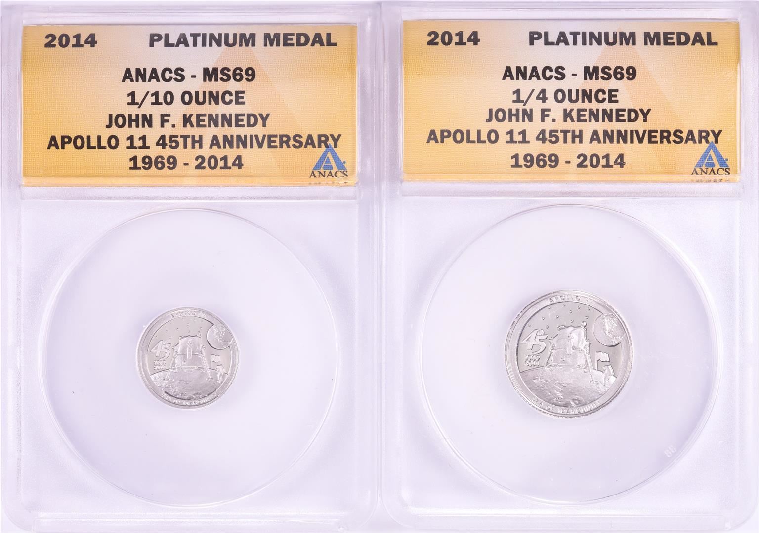 Set of 2014 Proof 1/10 & 1/4 oz Platinum JFK Apollo 11 Anniversary Medals ANACS MS69