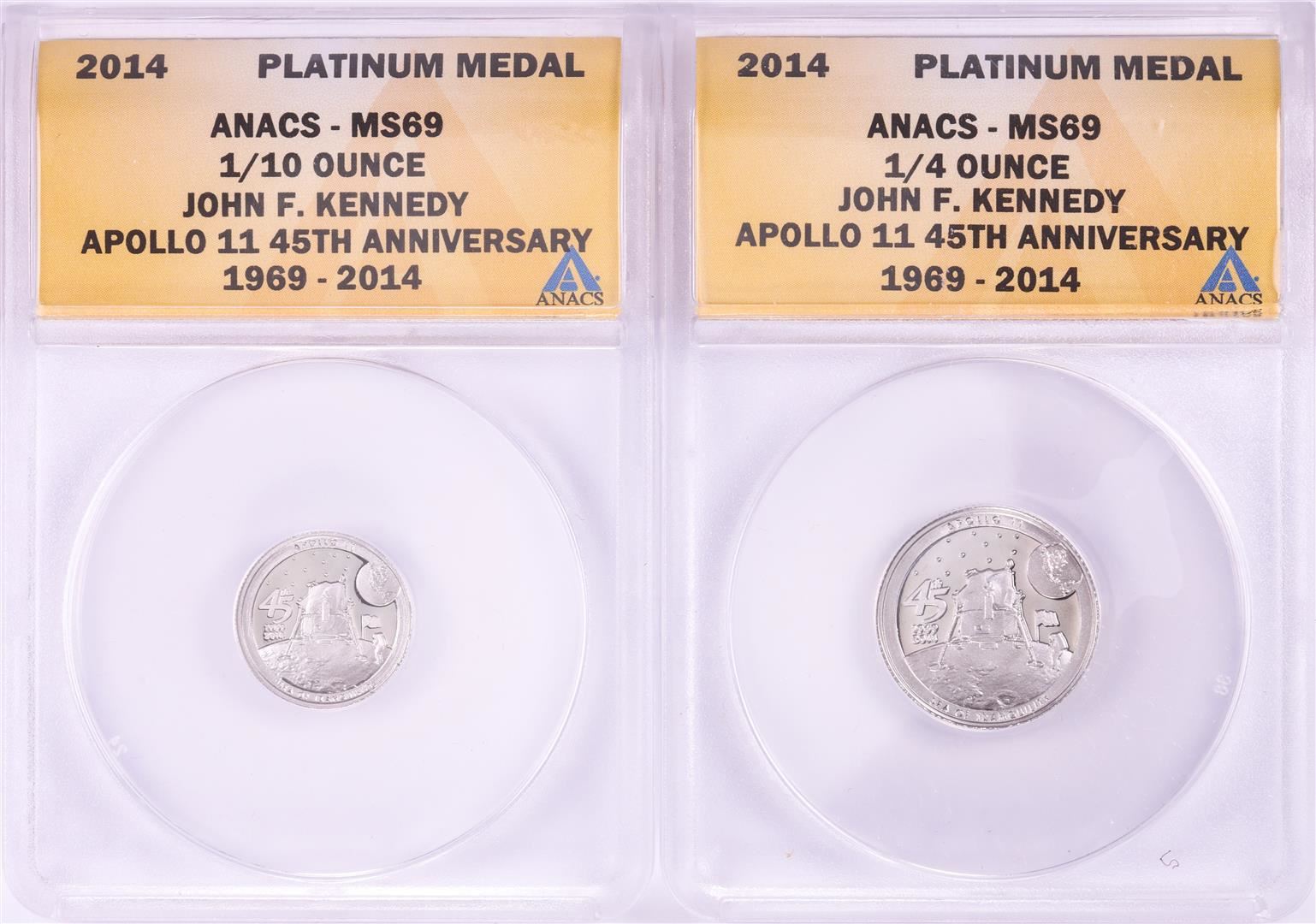 One Set of 2014 Proof 1/10 & 1/4 oz Platinum JFK Apollo 11 Anniversary Medals ANACS MS69. ANACS Certified.