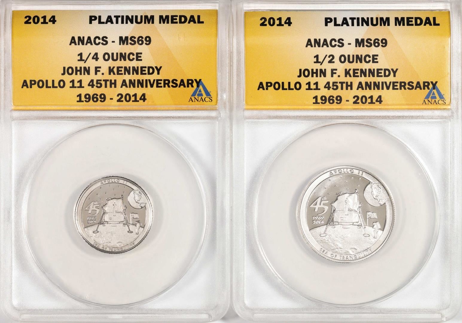 One Set of 2014 Proof 1/4 oz & 1/2 oz Platinum JFK Apollo 11 Anniversary Medal ANACS MS69. ANACS Certified.