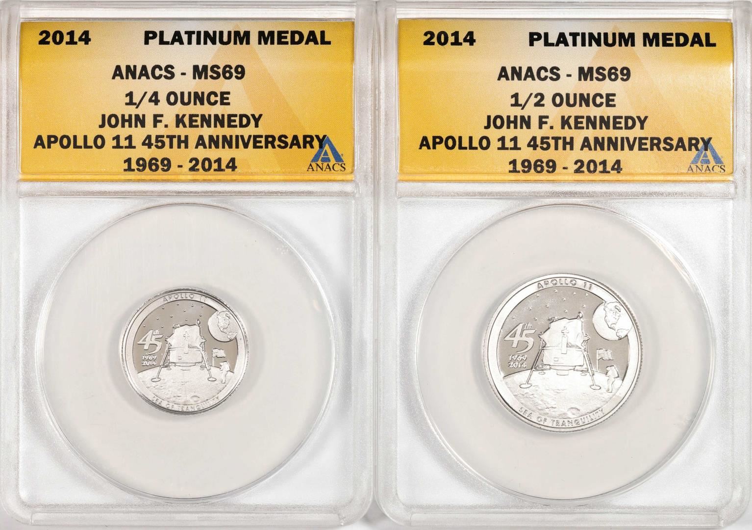 One Set of 2014 Proof 1/4 oz & 1/2 oz Platinum JFK Apollo 11 Anniversary Medal ANACS MS69. ANACS Certified.