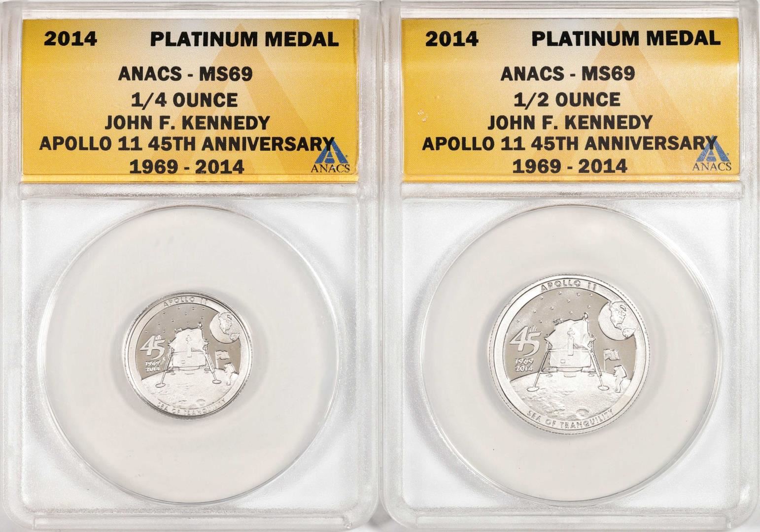 One Set of 2014 Proof 1/4 oz & 1/2 oz Platinum JFK Apollo 11 Anniversary Medal ANACS MS69. ANACS Certified.