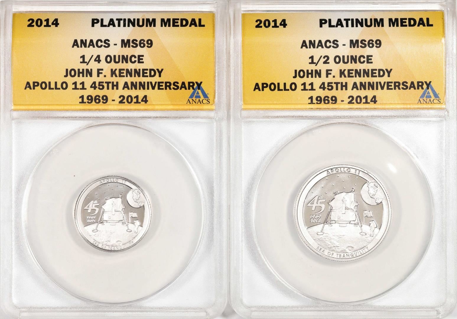 One Set of 2014 Proof 1/4 oz & 1/2 oz Platinum JFK Apollo 11 Anniversary Medal ANACS MS69. ANACS Certified.