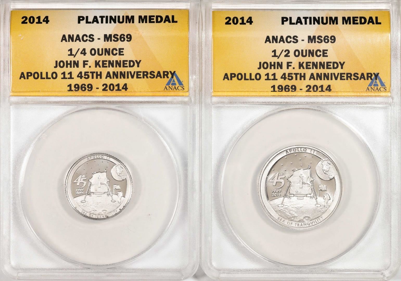 One Set of 2014 Proof 1/4 oz & 1/2 oz Platinum JFK Apollo 11 Anniversary Medal ANACS MS69. ANACS Certified.