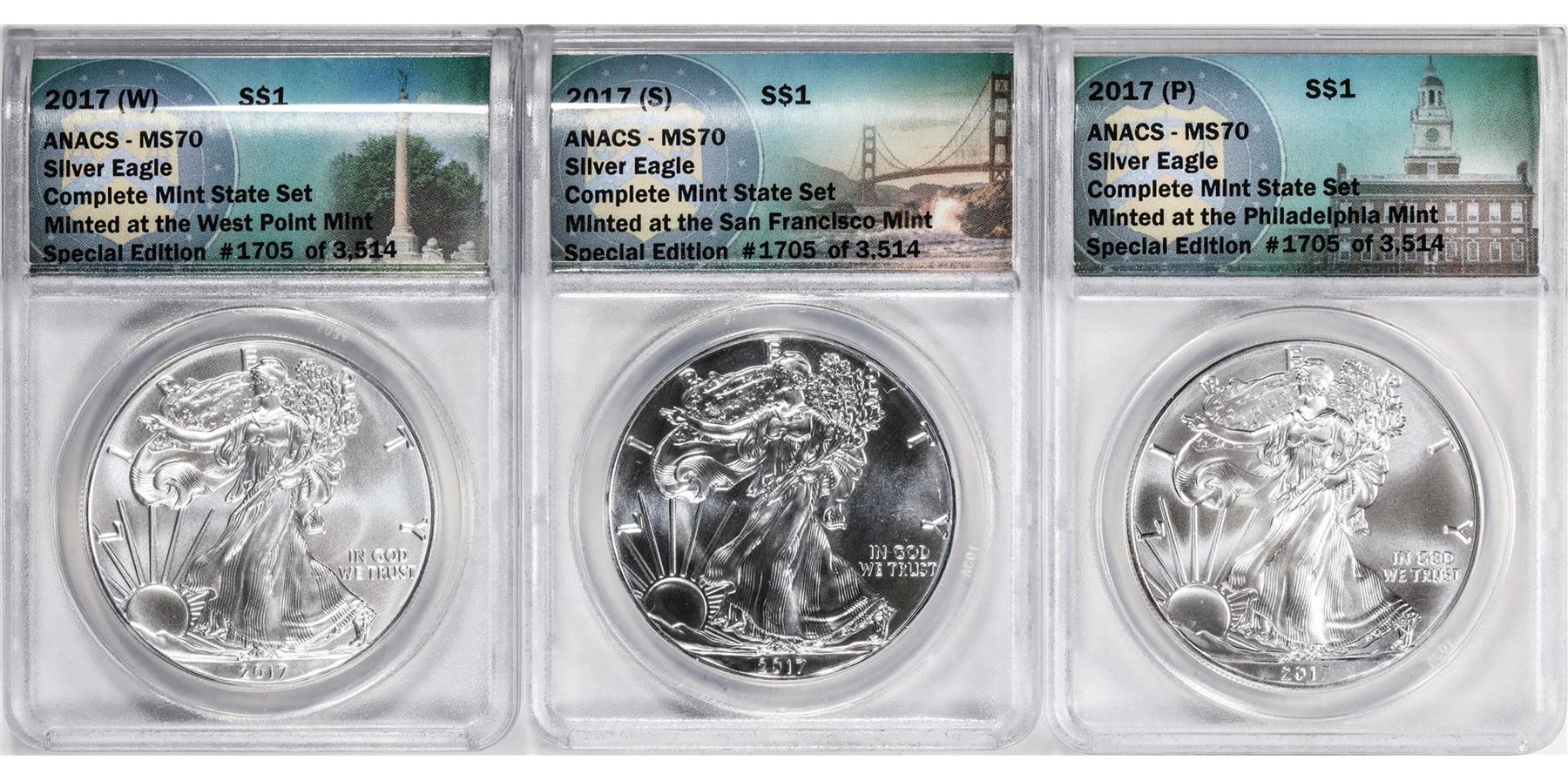 Set of 2017-W/S/P $1 American Silver Eagle (3) Coin Set ANACS MS70